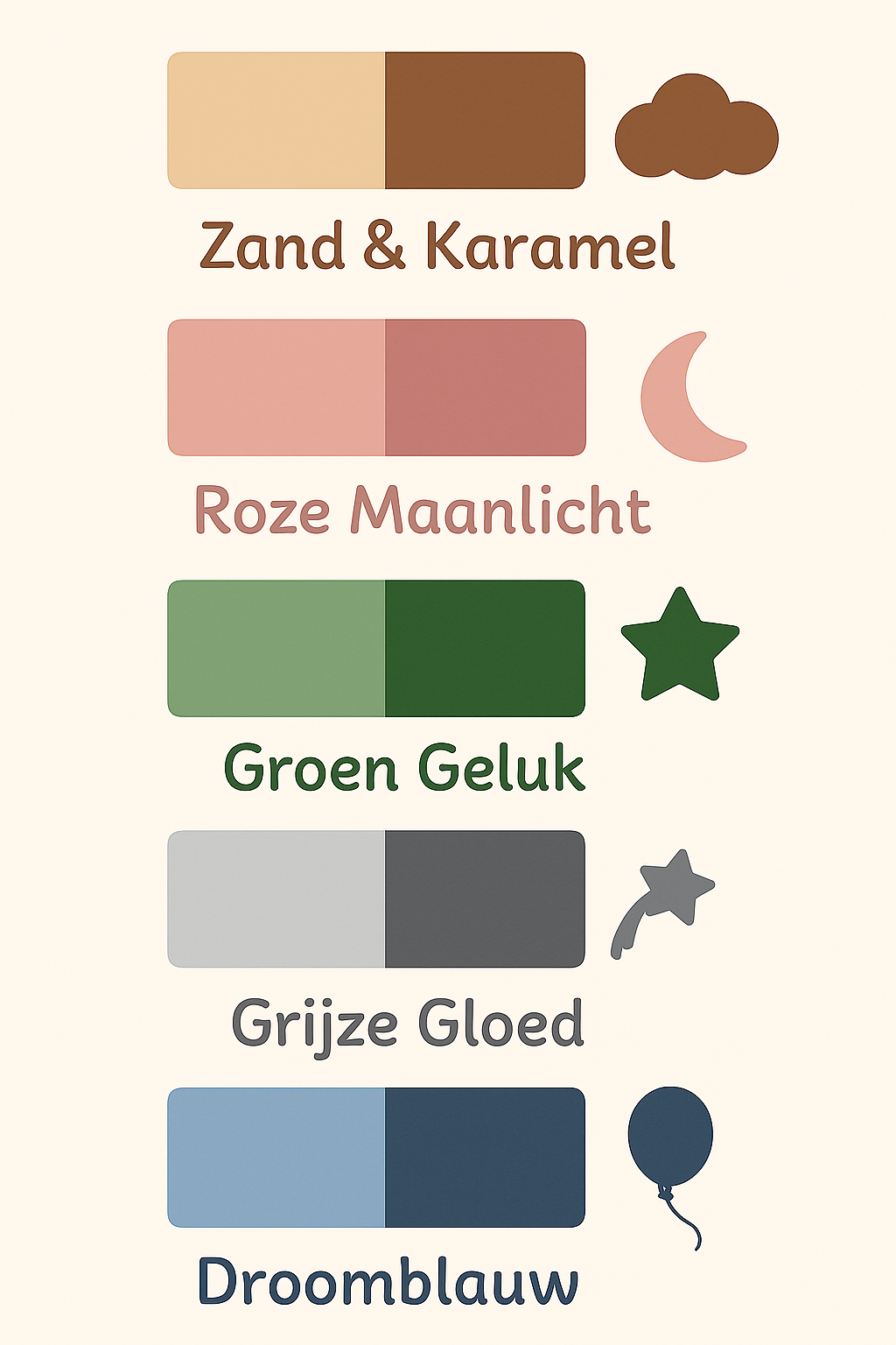 Bij Droommaatjes draait alles om sfeer, rust en stijl. Daarom werken we met vijf vaste kleurencombinaties die stuk voor stuk natuurlijk, tijdloos en perfect afgestemd zijn op baby- en kinderkamers.