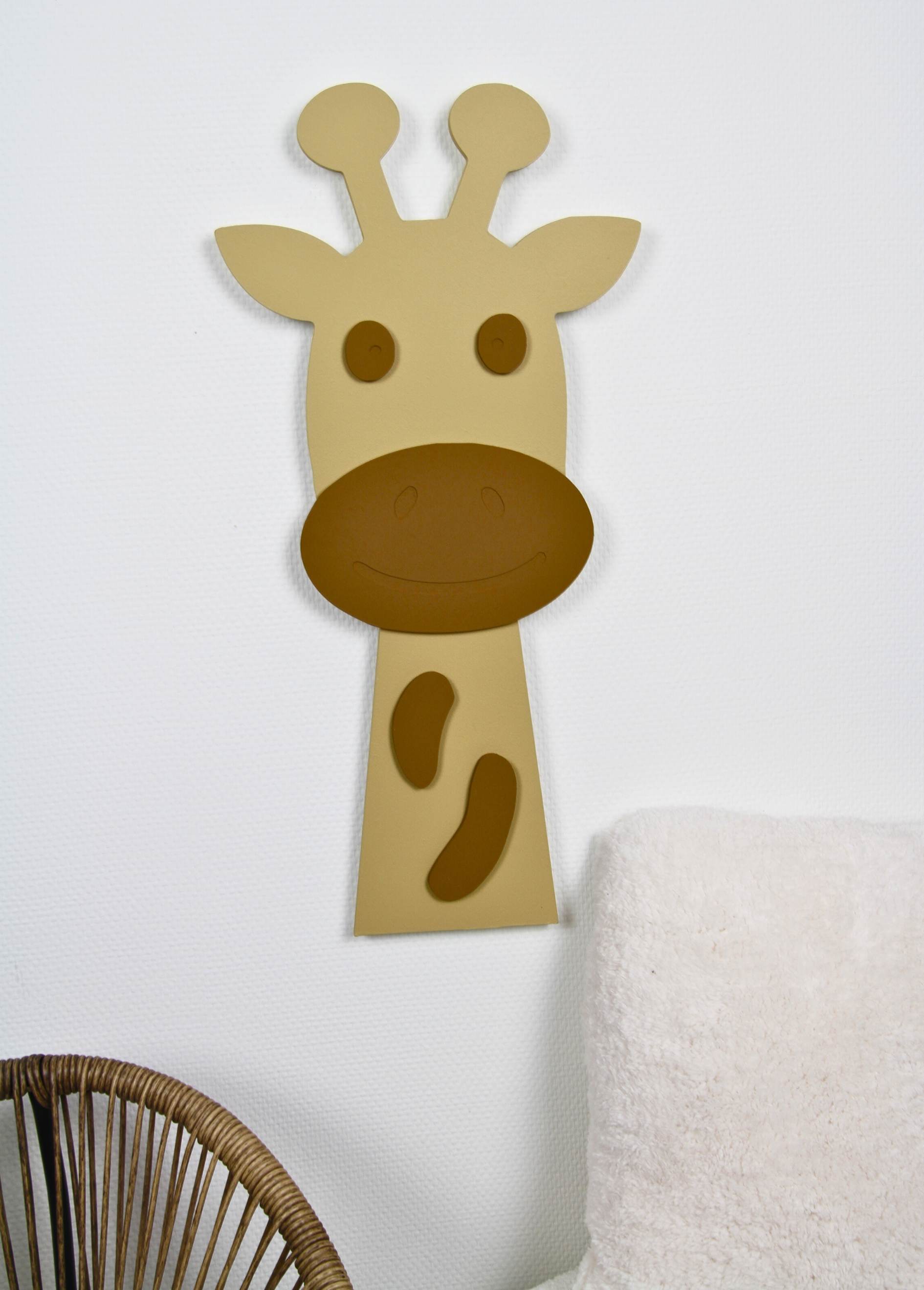 Speelse 3D wanddecoratie zonder lijst, en met net zoveel karakter en warmte als je van ons gewend bent. Deze uitvoering toont een Lieve Giraf opgebouwd uit meerdere lagen hout voor een subtiel 3D-effect dat direct opvalt aan de muur.