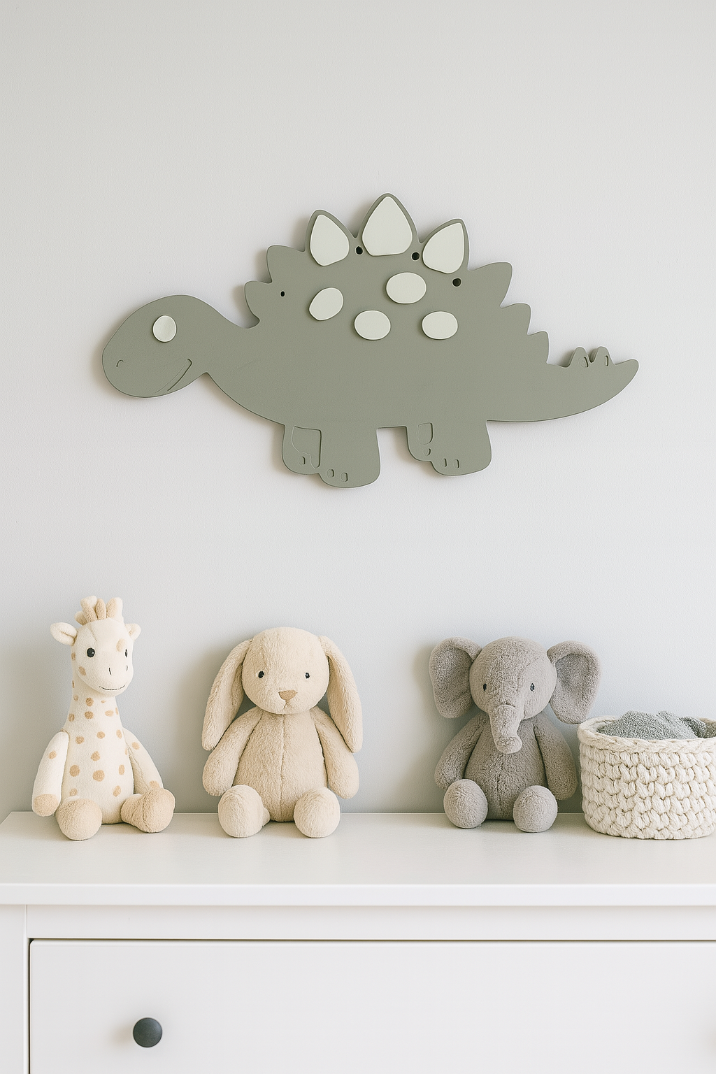 3D-wanddecoratie zonder lijst, en met net zoveel karakter en warmte als je van ons gewend bent. Deze uitvoering toont een lieve Stegosaurus, opgebouwd uit meerdere lagen hout voor een subtiel 3D-effect dat direct opvalt aan de muur.