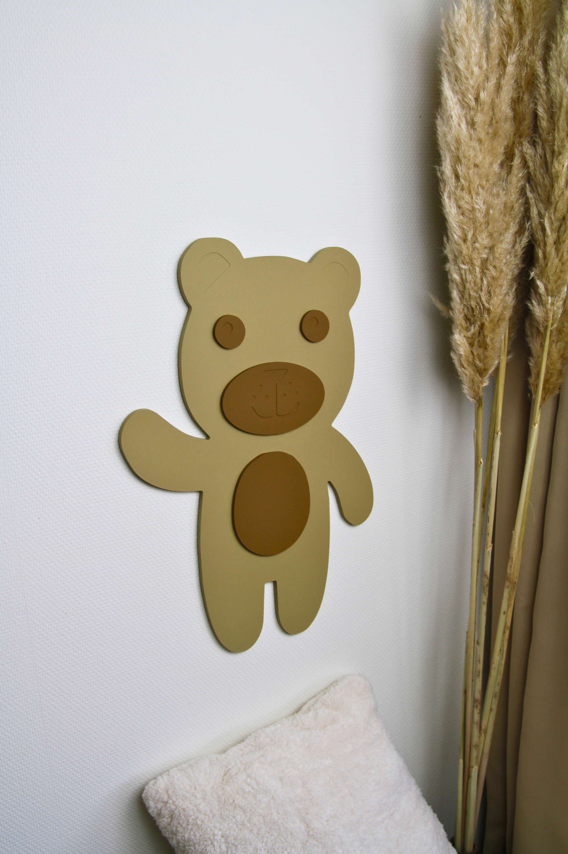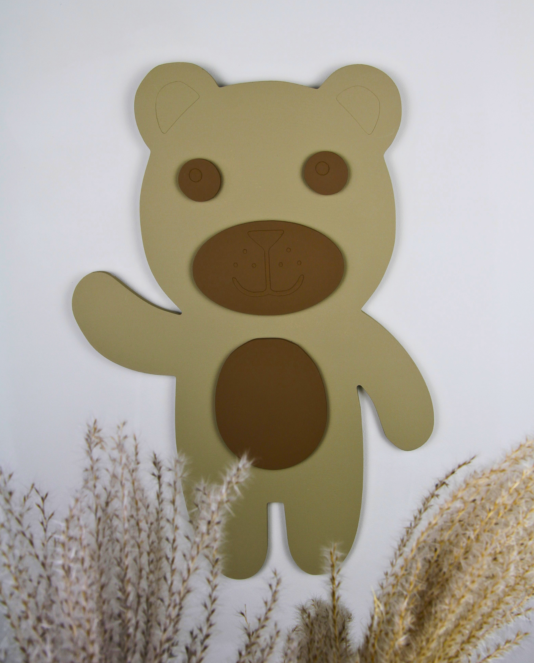 Speelse 3D wanddecoratie zonder lijst, en met net zoveel karakter en warmte als je van ons gewend bent. Deze uitvoering toont een schattige Teddybeer, opgebouwd uit meerdere lagen hout voor een subtiel 3D-effect dat direct opvalt aan de muur.