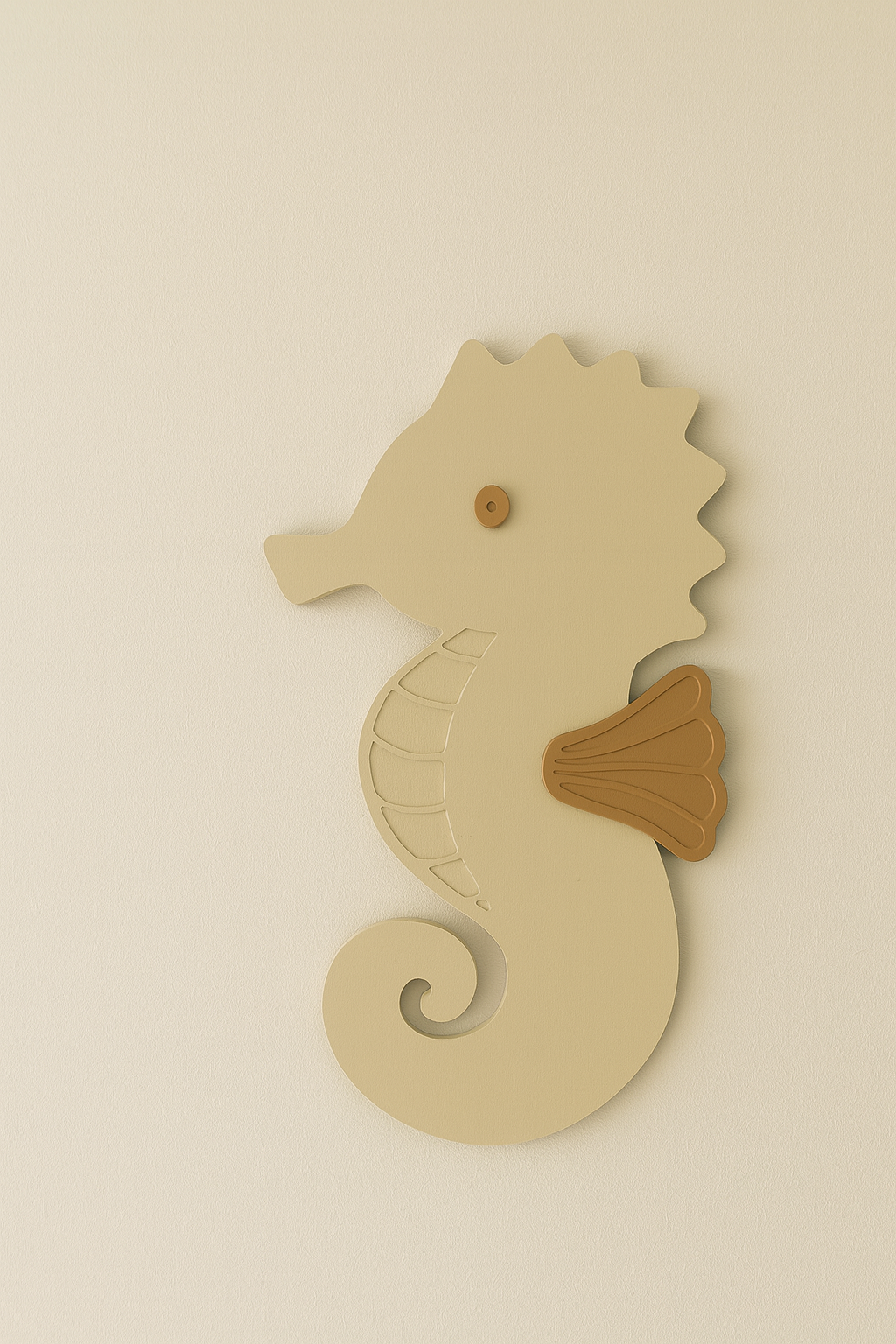 Speelse 3D wanddecoratie zonder lijst, en met net zoveel karakter en warmte als je van ons gewend bent. Deze uitvoering toont een lieve Zeepaard, opgebouwd uit meerdere lagen hout voor een subtiel 3D-effect dat direct opvalt aan de muur.
